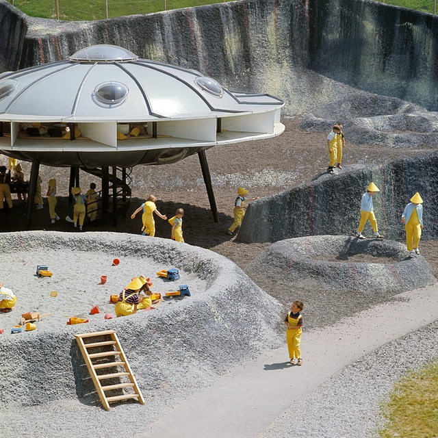 Ce jardin d’enfants est constitué d’un ensemble des bâtiments réalisé par l’architecte vaudois Michel Magnin en collaboration avec les ingénieurs du bureau Conrad Zschokke. Ce complexe en béton armé avait alors notamment pour objectif de montrer au grand public la grande diversité de formes et d’espaces pouvant être envisagée grâce à ce matériau révolutionnaire. Les formes étranges de ces bâtiments avaient également pour ambition de nourrir l’imaginaire des petits et de stimuler leur créativité.